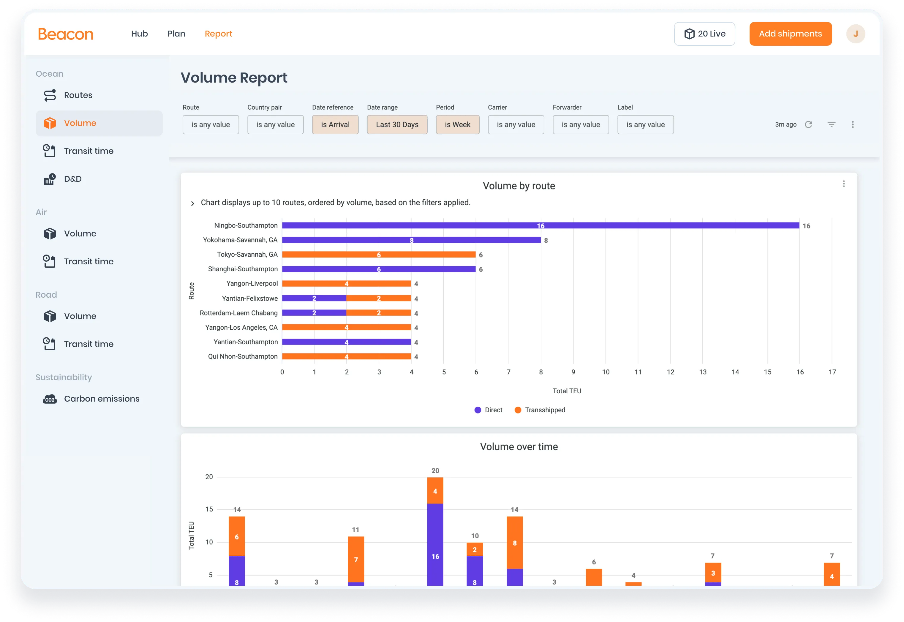 Pinch points are bottlenecks or areas where the flow of goods is consistently slowed or disrupted. Beacon helps you understand the ports that are the pinch points in your network.