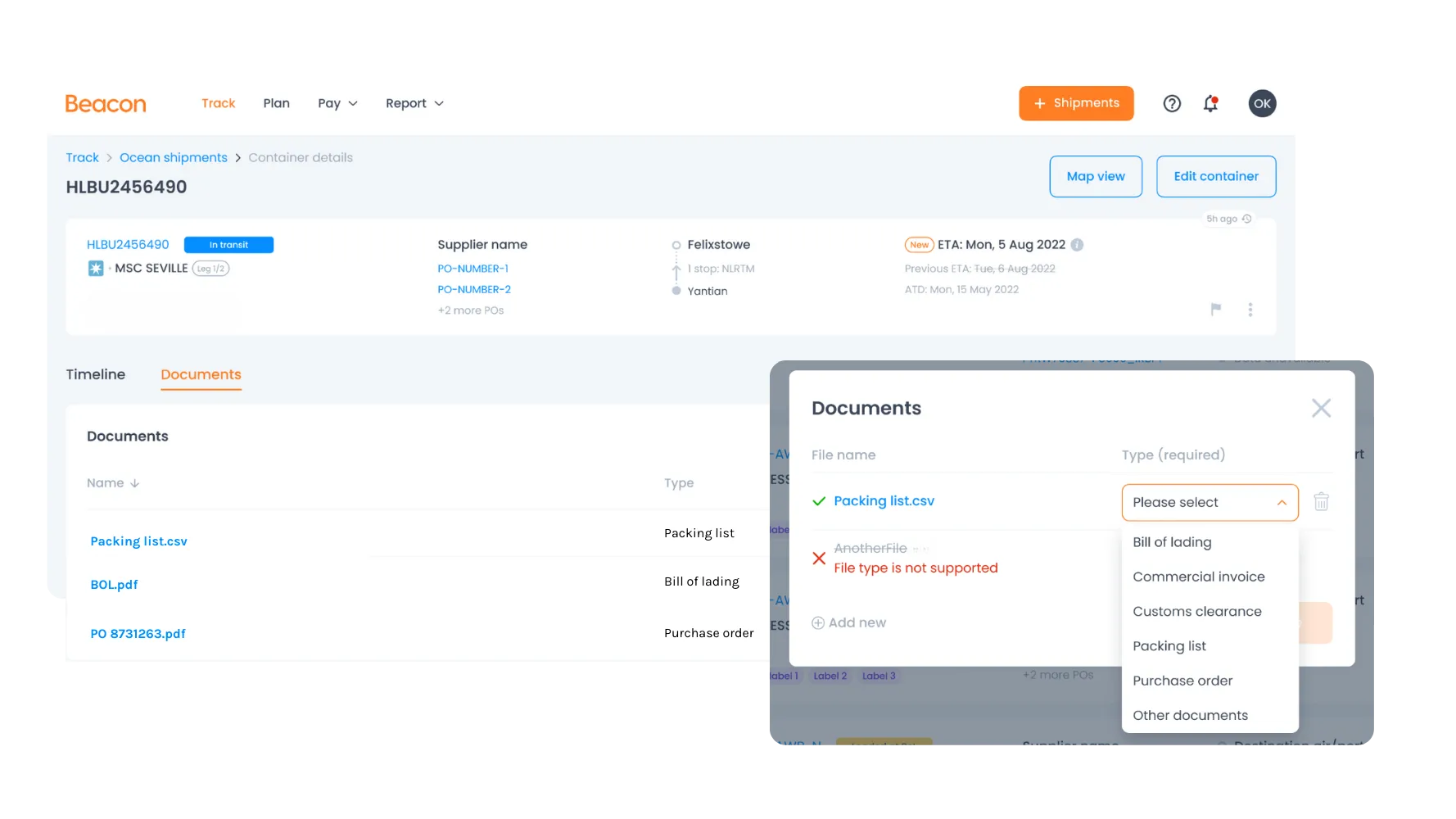 Open any shipment, navigate to the Documents icon next to the container information, and drag-and-drop files or click to upload.